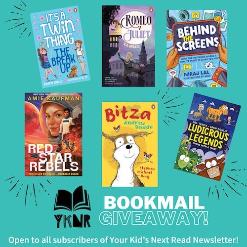 SPEAKING OF GIVEAWAYS, each month, we give away a prize pack consisting of some of the brilliant bookmail sent to us for the Your Kid’s Next Read podcast. One winner** is chosen from our full subscriber list by random draw and announced here!
